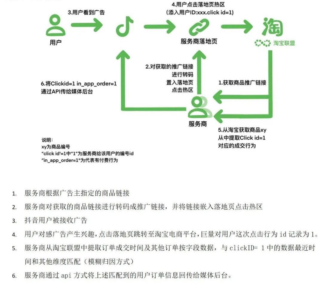 clickID 最早是给线索这类大客户用于跟踪用户数据使用,后续有广告主挖掘出电商引流这套用法,21年推广到部分广告主尝试投放。clickID 目前有两种归因方式,一种是模糊归因,通过采用查询订单成交时间,地址,手机,ip等字段参数,去匹配对应的属性和就近时间的 clickID 方式。另外一种是归因,是在落地页上将 pid + rid 和 clickID 进行绑定实现的。