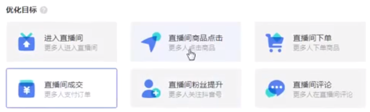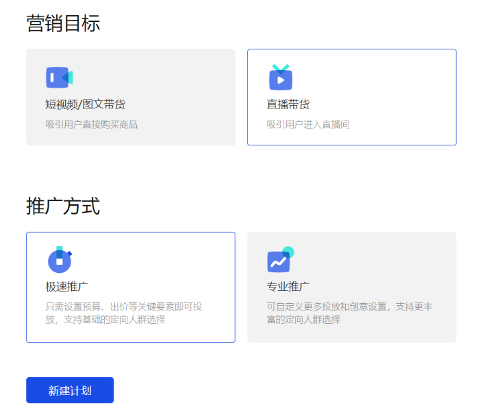 1:营销目标选择 巨量千川营销目标有两种:【短视频图文带货】吸引用户购买商品和【直播带货】吸引用户进入直播间,大家可以结合自己的营销目标来进行选择。