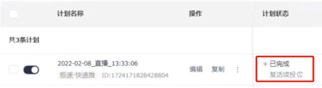 6:投放时长 当极速的计划到了时间之后,就是【已完成】的状态,不能再开了,可以通过【复活续投】继续投放。