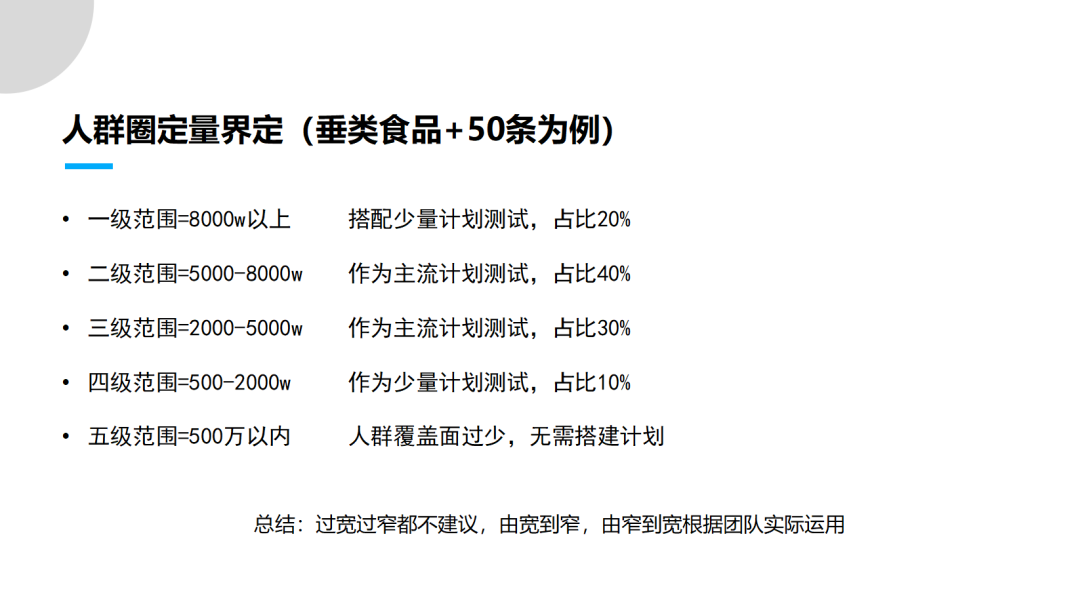 对于一个新户,当我们无法去判断什么定向,什么人群规模适合,这样的处理方式是最佳的。