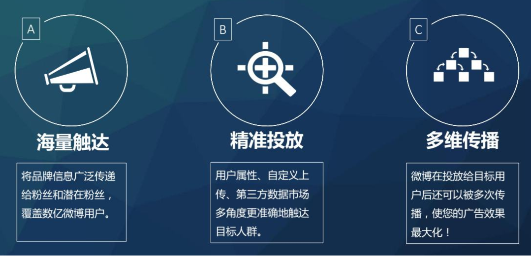 “粉丝通”是基于微博海量的用户,把推广信息广泛传递给粉丝和潜在粉丝的广告产品。广告主可以根据用户属性和社交关系将信息精准的投放给目标人群,广告推广更加精准,有效推广信息包括博文推广、帐号推广及应用推广三种。同时微博“粉丝通”也具有普通微博的全部功能,如转发、评论、收藏、赞等,可实现广告的二次传播。从而大幅提高广告转化率。