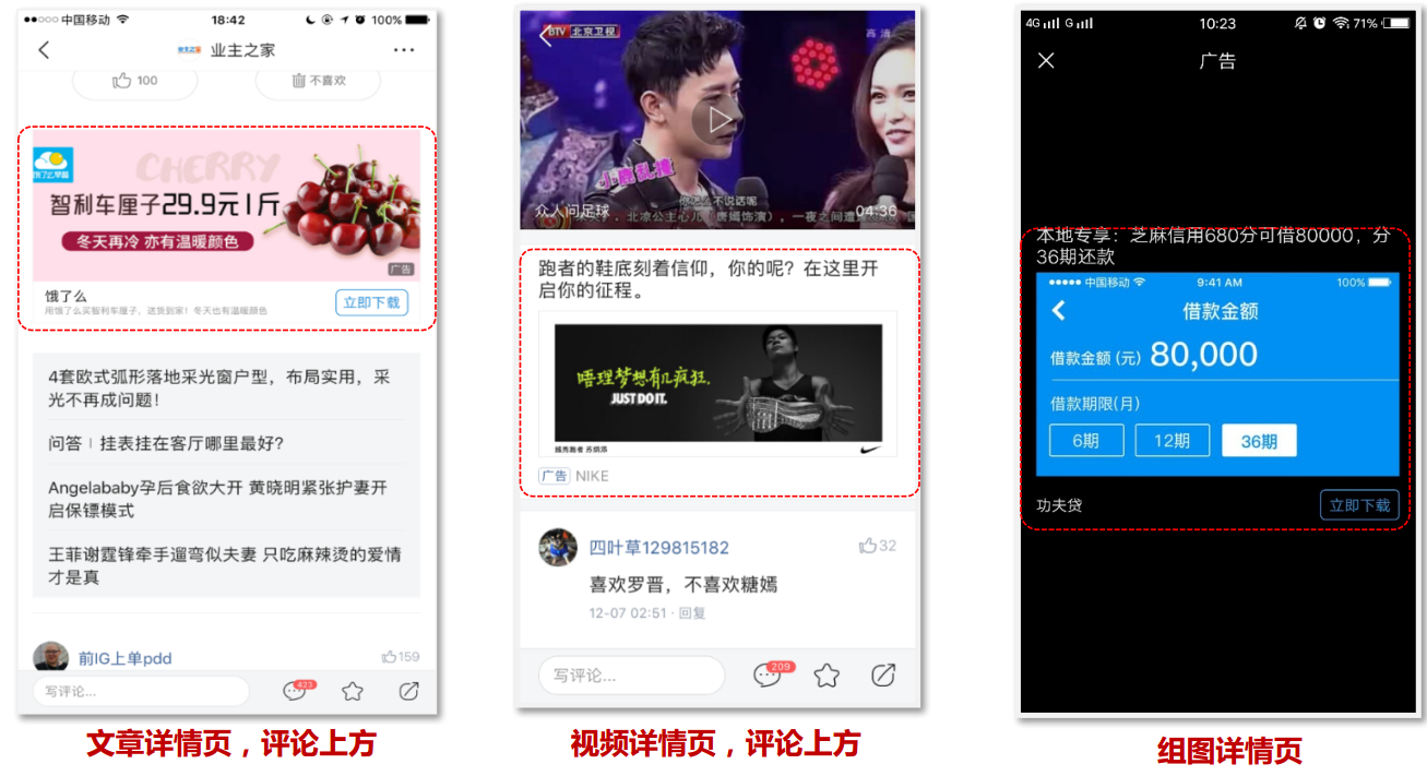 详情页广告:展示在文章详情页的一种广告形式,在版权文章下方,相关阅读上方。