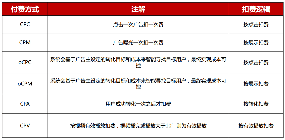 4.ocpc:按点击扣费,根据广告主设定的转化目标和成本智能寻找用户,成本可控 。