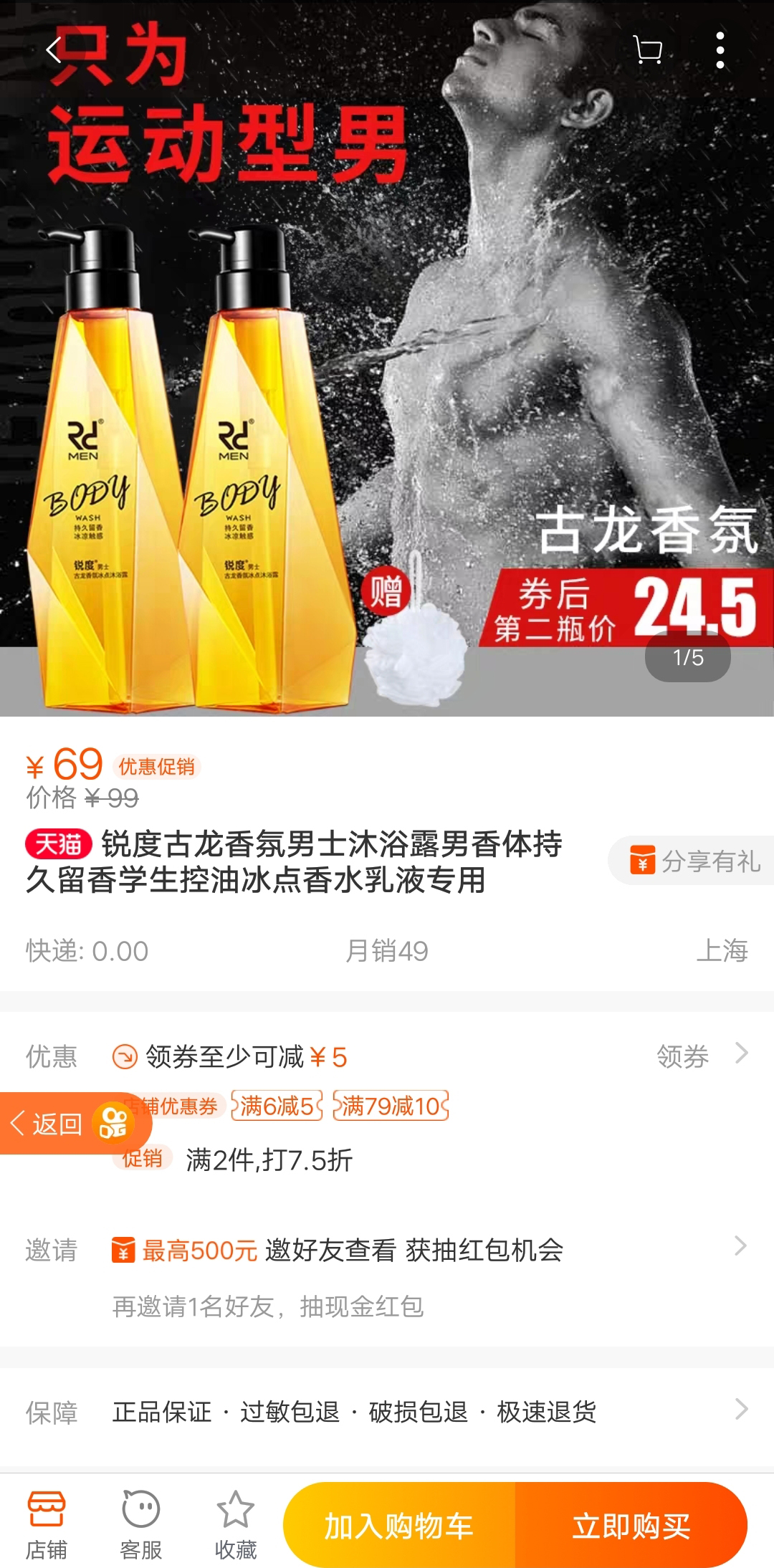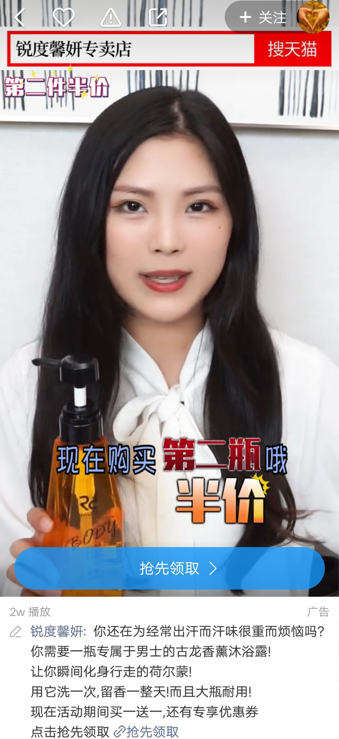 落地页直接跳转至锐度馨妍专卖店的天猫店铺沐浴露的详情页,在这个页面,想要购买的用户可以先领取优惠券然后再下单,不过用户肯定觉得买一瓶不划算,因为两件才打折,这可以算是广告主的一种销售吗?