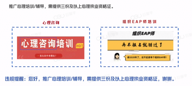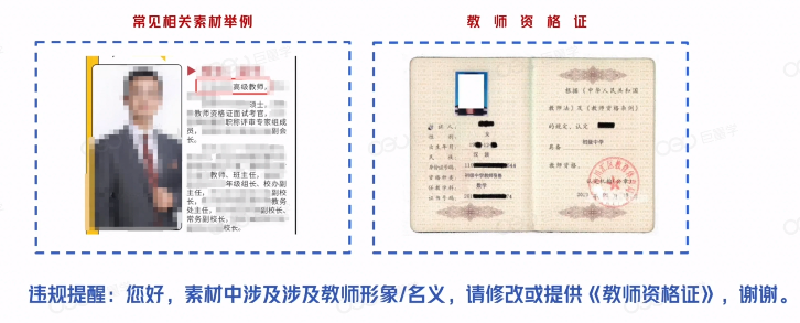 如左图所示,教育行业的广告内容,对师资的相关介绍中,如出现了教师的形象或名义时,需要广告主提供相应的教师资格证。
