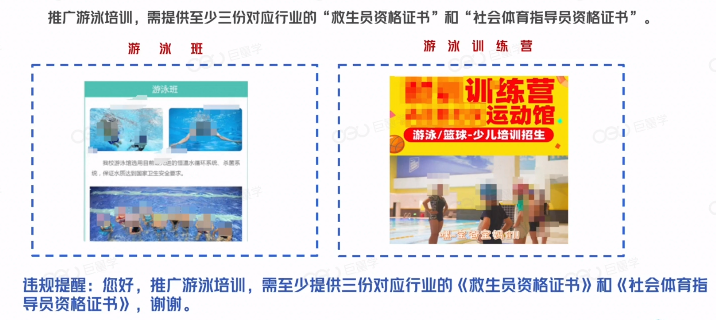 如图所示的游泳班和游泳训练营,如果投放时缺少相关资质,则会收到相应的违规提醒。