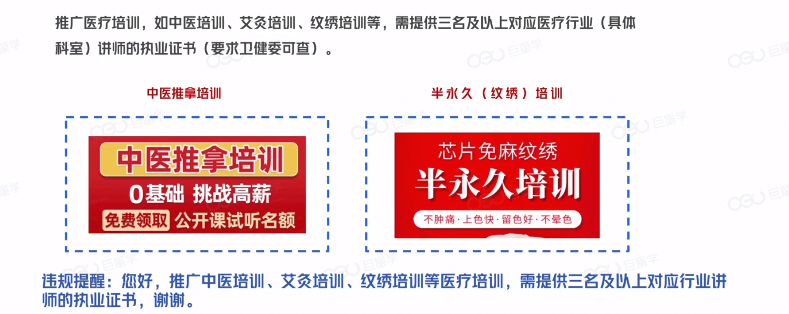 医疗一直都是一个非常非常重要的行业,关系着用户的生命安全,所以国家对医疗从业者的能力资质要求是非常严格的,如果广告中出现医疗培训,无论是中医推拿还是其他纹绣培训,都是要提供相应资质。