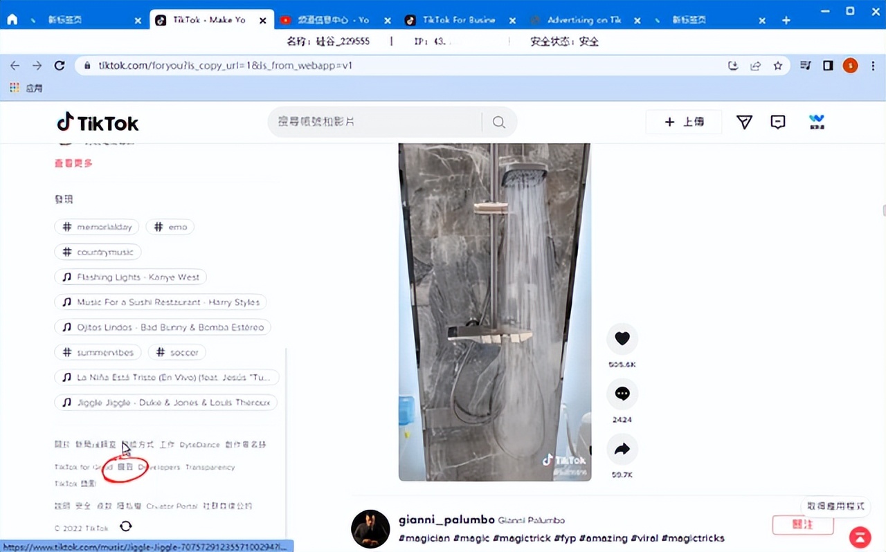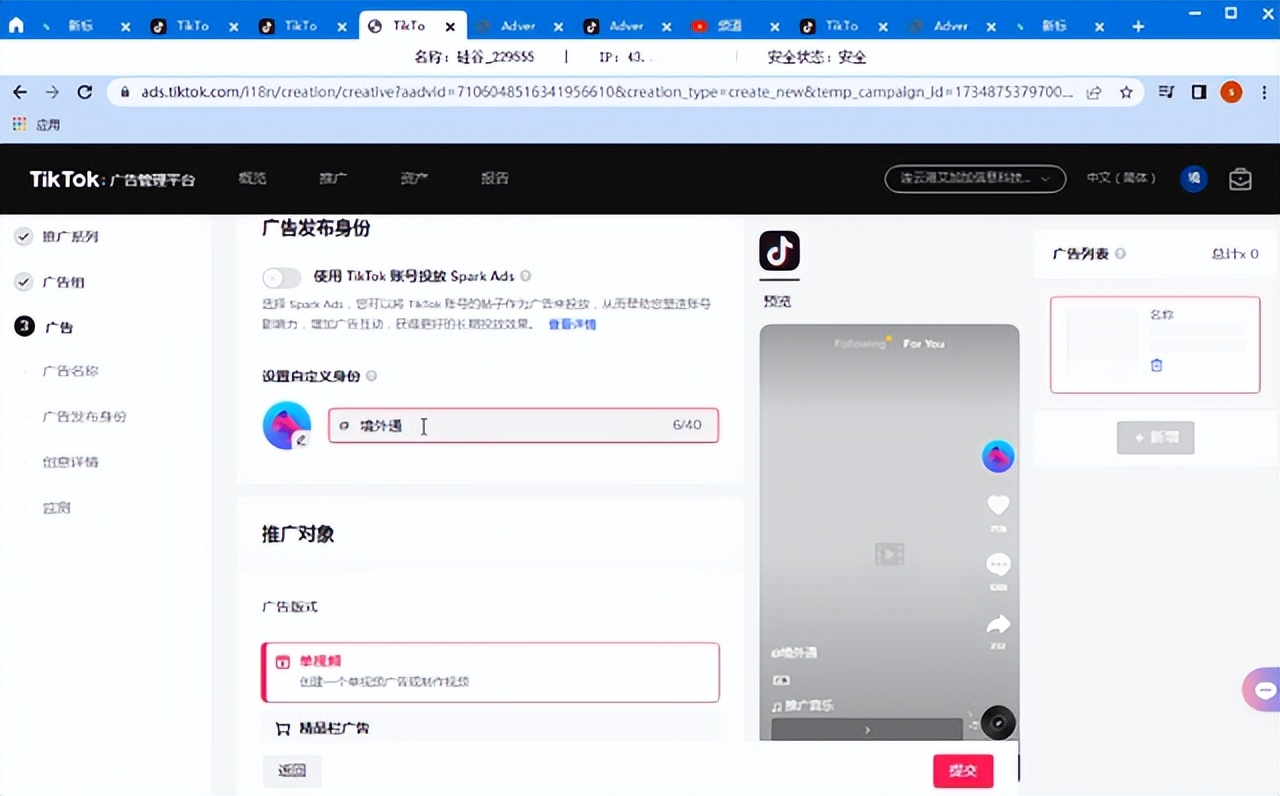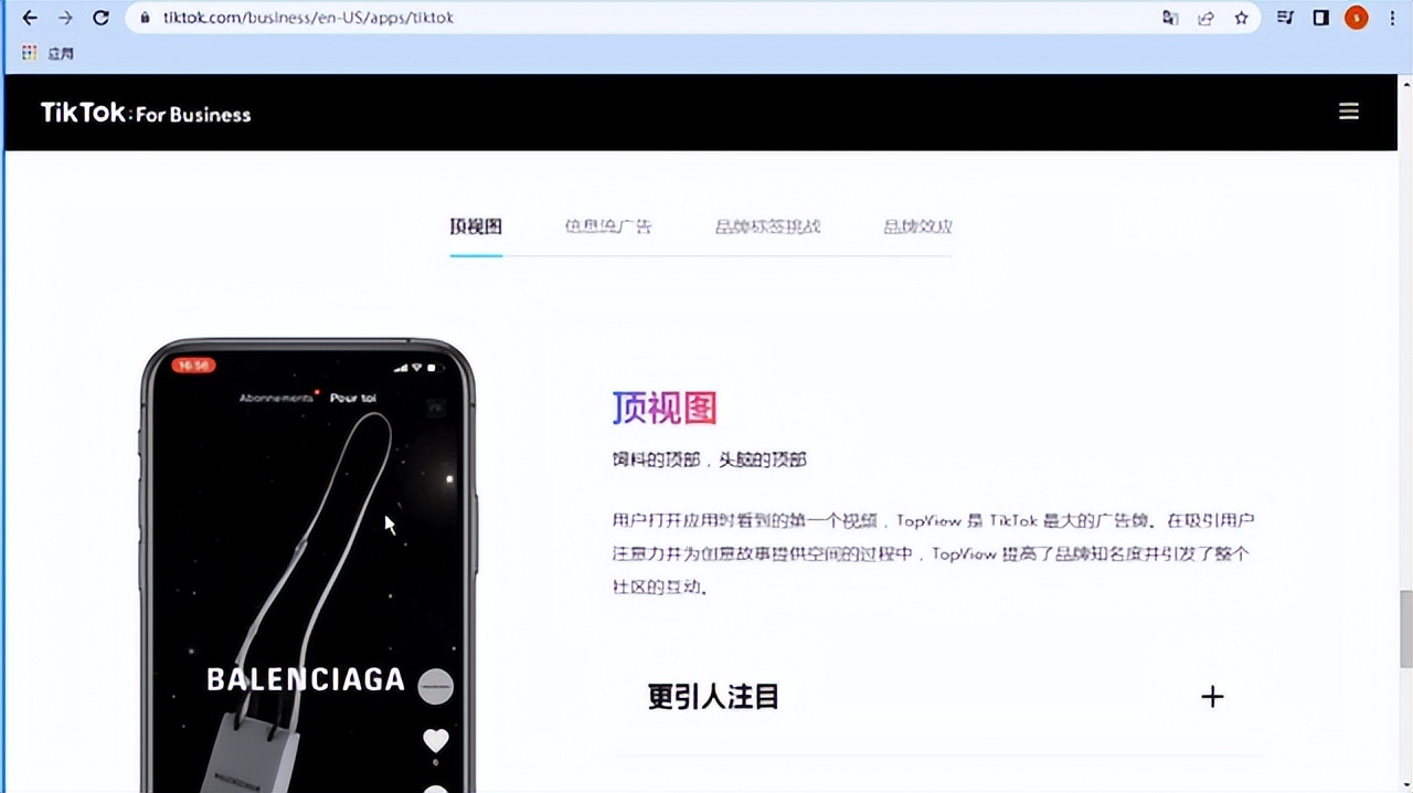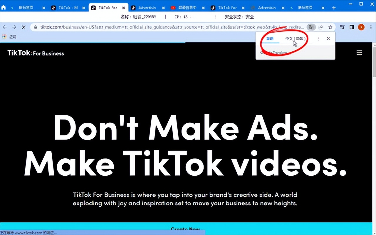 首先我们打开境外通浏览器,进入Tik Tok,下拉找到广告按钮,点击进入: