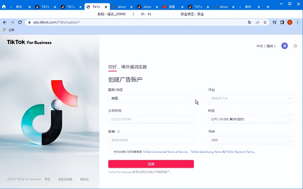 投放Tik Tok广告首先需要创建一个广告账户,根据要求,填写国家地区、行业、公司名称、时区、邮箱、币种,点击注册,就创建成功了。