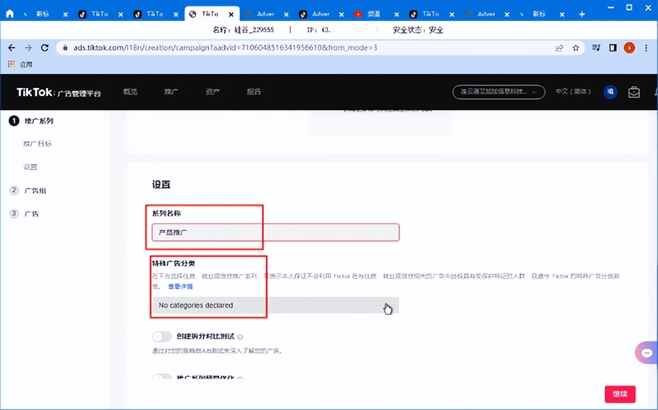 3、选择是否开启AB测试,若开启,需要创建两个广告组;开启推广系列优化后,日预算需选择50美元。选择完成后,点击“继续”。