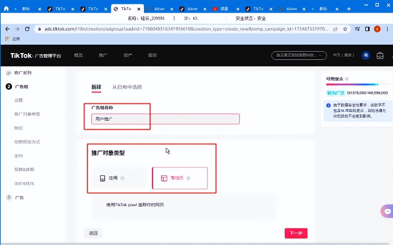 1、填写广告组名称,选择推广对象类型,如果需要引导用户下载APP,可以选择“应用”,如果需要引导用户访问网址,可以选择“落地页”。