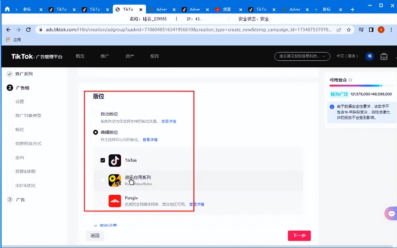2、选择推广版位,一般我们默认选择tiktok即可。