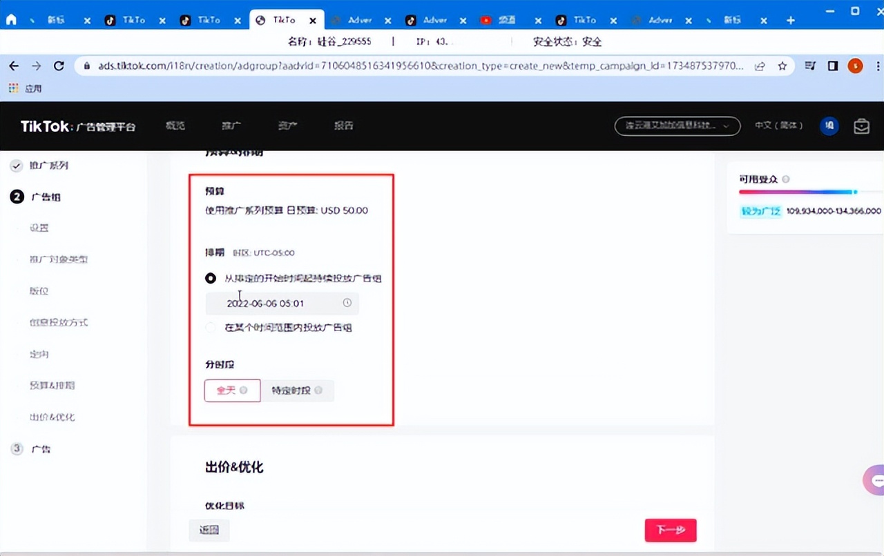 4、设置预算即推广排期,也就是我们广告在哪个时间段内开始投放广告。设置完成点击“下一步”。