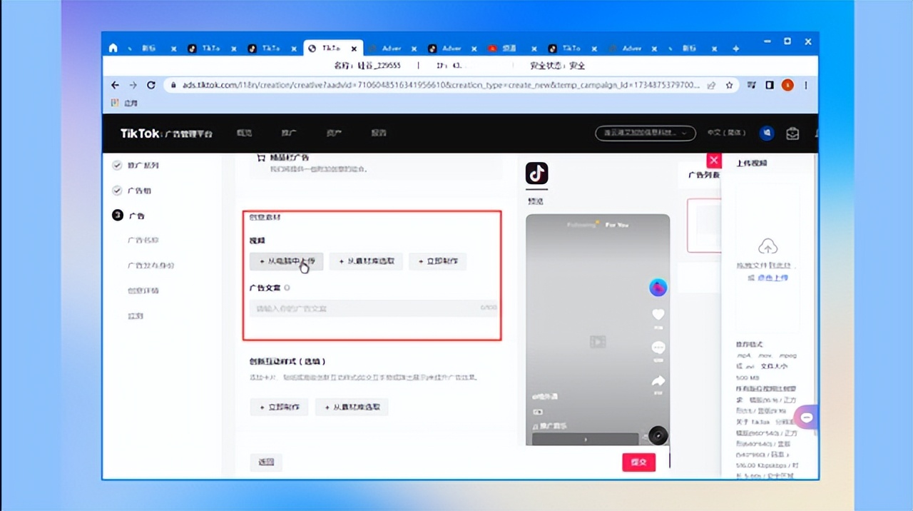 2、上传视频,编辑广告文案。