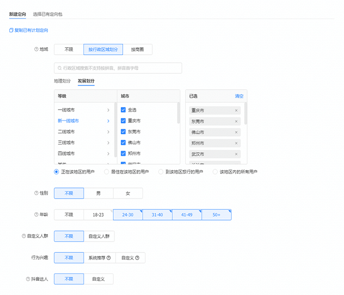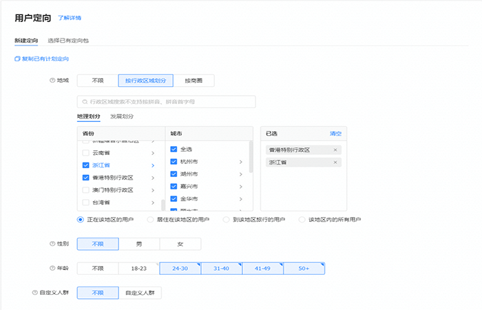 当然除去地域的定向选择外,您还可以根据,性别,年龄,自定义人群,行为兴趣,达人等定向标签去选择您想要投放的目标人群。