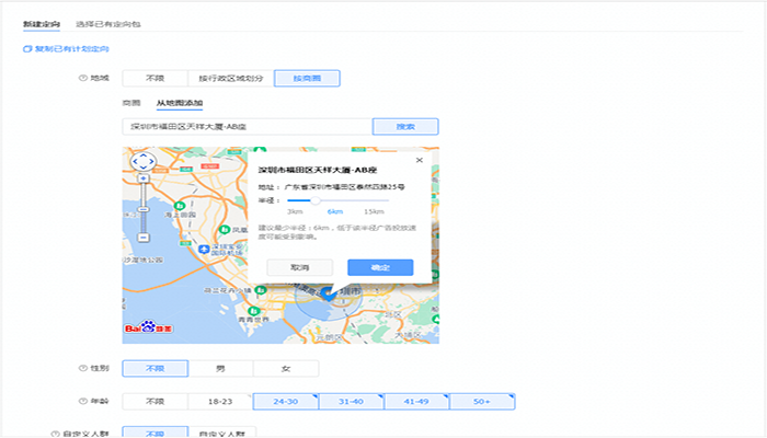 从地图添加的话,您可以直接选择你想要投放的地区,以该地区为中心再去选择你想要辐射的半径,在3——15公里范围内去选择。
