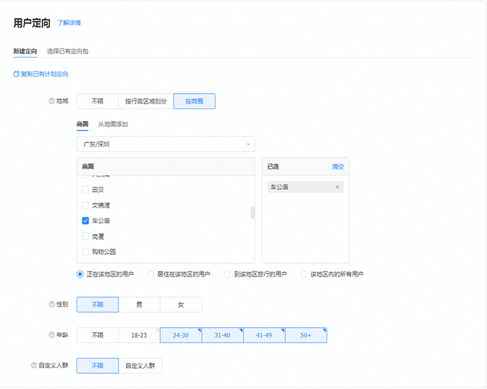 按照商圈划分的话,我们可以先去选择您想要投放的城市,再去选择该城市您想要投放的商圈如下图选择的广东省深圳市车公庙这个商圈,您也可以选择该城市的多个商圈。