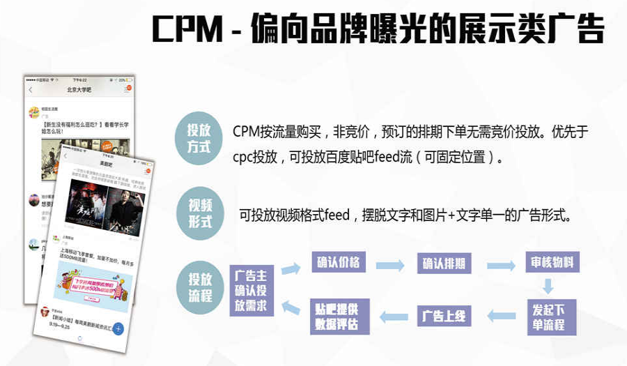 CPM广告投放的特点:CPM广告投放是按照流量购买的,这种广告不用要求竞价排名,广告预定也不需要竞价投放,广告形式也比CPC的广告优先,同时广告位置是固定的。