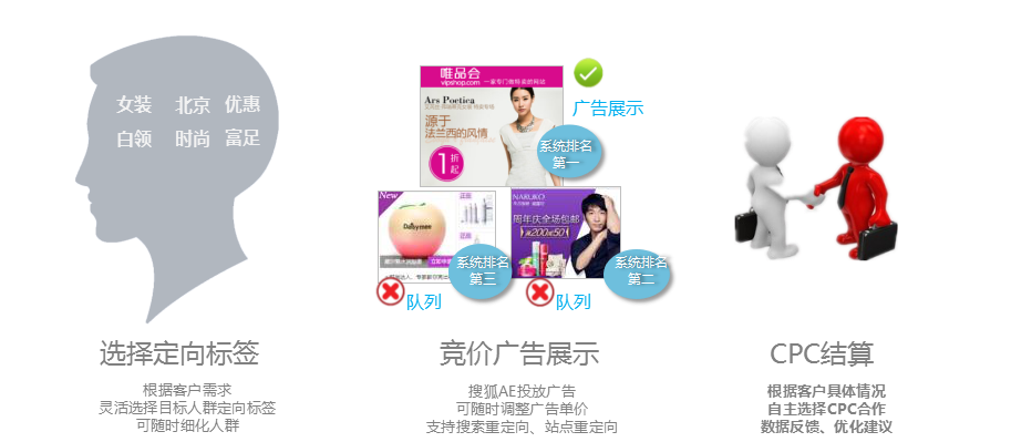 客户选择精准定向标签投放,以CPC方式计费合作,实时调整单价和人群