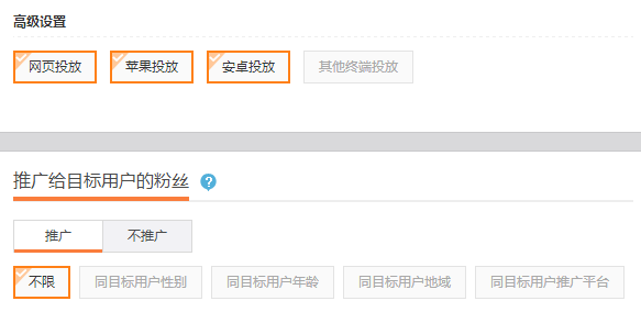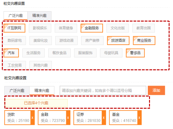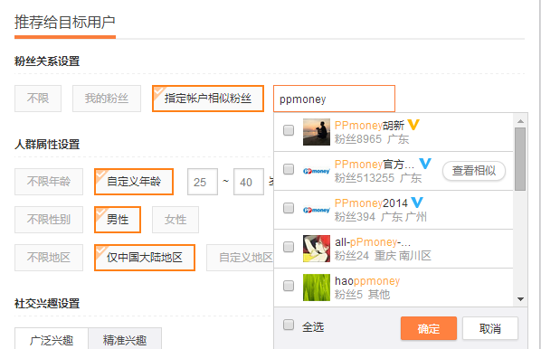 精准投放优势1:粉丝关系:微博粉丝通可以指定账户账号相似粉丝,也可以根据年龄群、性别、地区等进行广告投放,以粉丝之间相同的标签来进行广告投放(如下图所示)